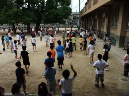 本日は、1年生と5年生、2年生と4年生、3年生と6年生がドッジボールをしました。どんなルールでおこなったのでしょうね。全校児童が運動場の3箇所に分かれて楽しんでいました。