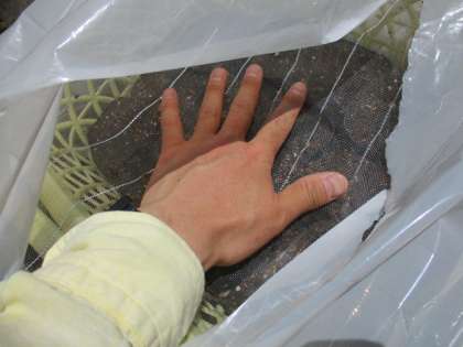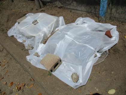 そこで,ふくろを切ってかぶせて,かんたんなビニールハウスを作りました。写真では分かりにくいと思うのですが,手を入れてみると,とても暑くなっていました。