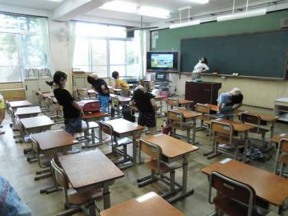 昨日と同じように,1クラスを2〜3つに分散させて,学習課題をしたりラジオ体操をしたりしました。