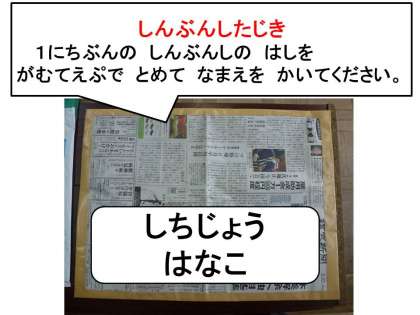 さて,ずがこうさくかで つかう こうさくまっとと しんぶんしたじきですが,しゃしんの ように よういします。じぶんの ものだと わかるように なまえも かいてくださいね。