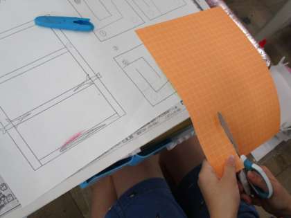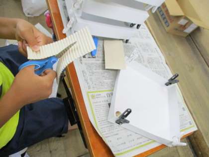 今日は,立体迷路の土台となる4つの箱をつくり,通路をつくり始めました。子どもたちは,前回描き起こした設計図を基にして,楽しそうに活動していました。