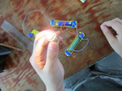 子どもたちは「乾電池を2つ使えばいいよ。」と考えたので,乾電池を2つ使っていろいろな回路を試しました。すると,つなぎ方によって結果が異なることを見つけました。
