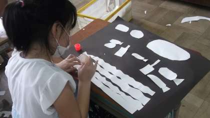 図画工作科「はさみの あーと」の学習で,はさみで切った白い紙を黒い画用紙の上に並べて何が見えてくるのかを考えました。