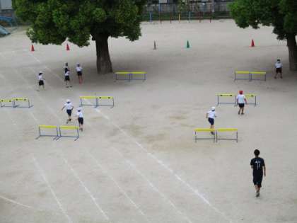 3組は体育科『ハードル走』の学習で,ハードルに向かって勢いよく走っていました。歩幅を合わせながら,リズムよく跳んでいました。