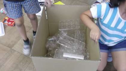 家から持ってきたペットボトルや箱等の中から好きなものを使って遊びました。箱を高く積み上げたり,ペットボトルのキャップでピラミッドを作ったりしました。