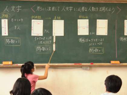 文字の形に注目して,人文字をつくるために必要な人数を求めるきまりを考えました。様々な考え方が紹介されましたが,中でも「直線に直した時に,両端に人がいるかどうかで見分けたらいい」と,前で操作しながら説明していたのがとても分かりやすいなあと感じました。