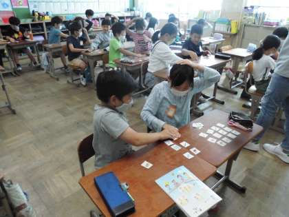 「pencil case」と「pencil sharpener」など,英単語の細かな違いを聞き分けながら楽しく活動していました。学習中だけでなく,休み時間も使って友達と一緒に「カルタゲーム」をしている子もいました。