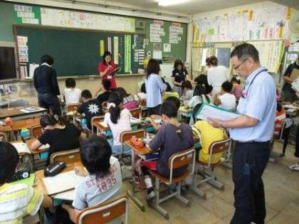今日は5年1組を会場に、実際の授業を通して国語科学習の進め方について、先生も学習しました。子どもたちは意欲的に自分の考えを発表していました。また、友達の意見を聞いたあと、100字以内に自分の考えを書いていました。