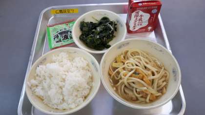 今日の給食は「ごはん」「牛乳」「カレーうどん」「ほうれんそうの煮びたし」「黒大豆」でした。