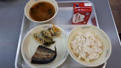 今日の給食は「麦ごはん」「牛乳」「切干大根の煮びたし」「開干さんまのからあげ」「みそ汁」でした。