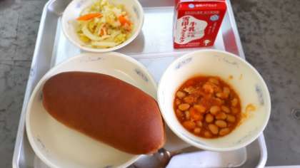 1月13日(水)今日の給食は「黒糖コッペパン」「牛乳」「大豆と鶏肉のトマト煮」「野菜のホットマリネ」でした。