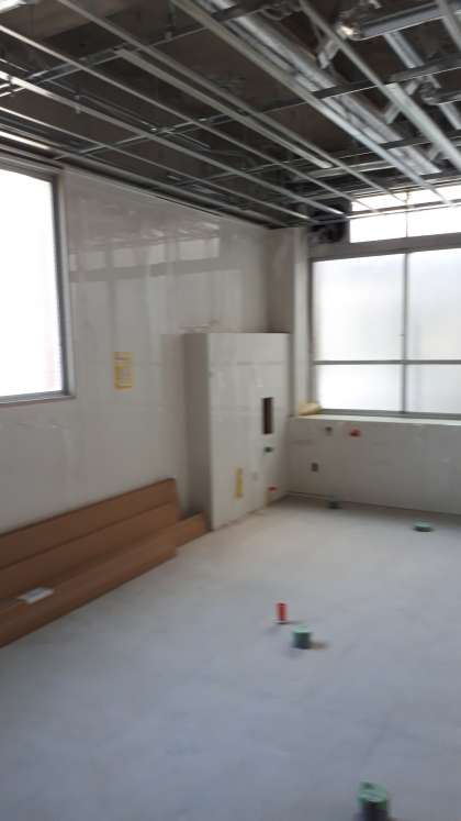 トイレ改修工事が進んでいます。現在,配管工事は終了し側面の化粧ボードが貼られました。今後は,床シートを貼り仕上げ,トイレブースの設置等が行われます。3月上旬の工事終了まで順調に進んでいます。出来上がりが楽しみです。