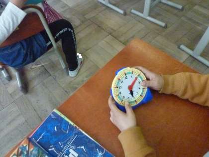 子どもたちは,「短い針で何時をよむ」,「長い針で何分をよむ」ことを知り,時計の模型を使って勉強しています。