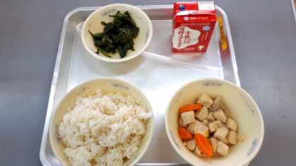 2月8日(月)今日の給食は,「麦ごはん」「牛乳」「高野豆腐と野菜の炊き合せ」「ほうれん草のおかか煮」でした。「高野豆腐と野菜の炊き合せ」は高野豆腐にだしの味がよくしみ込んでいます。鶏肉や野菜もたっぷりで,一緒に味わっていただきました。