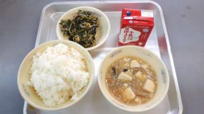 2月12日(金)今日の給食は「ごはん」「牛乳」「豚肉と豆腐のくず煮」「ほうれん草ともやしのごま煮」でした。