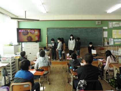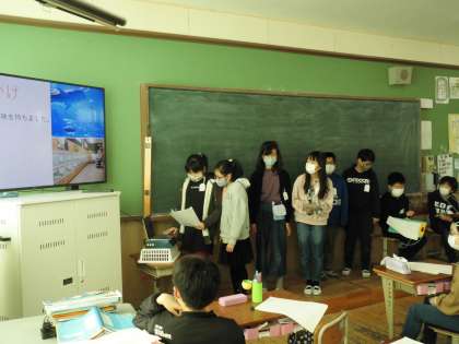 新型コロナウイルスが様々な仕事にどのように影響を及ぼしているのかについて調べ,自分たちにできることを考えました。5つのグループが発表し,グラフや資料を読み取り,考察することができていました。オンライン交流会は,緊張している様子でしたが,画面の向こうにいる相手に伝わるように一生懸命発表していました。