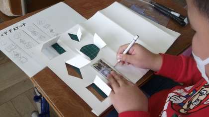 カッターナイフを使って窓を作っています。子ども達は,