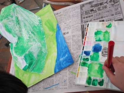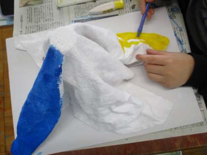 造形展に展示する立体作品『トロトロ,カチコチ・ワールド』の学習が始まっています。先週は,不織布に液体粘土を染み込ませて,土台作りを行いました。