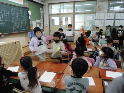 国語の時間に「これはなんでしょう」という問題を出し合いました。友達と2人で考えて2人で問題を出しています。聞く人は,答えに近づくように,まっすぐ手を挙げて質問をしています。ヒントを聞きながら少しずつ答えに近づいていきます。