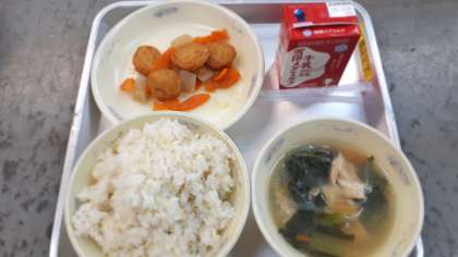 2月18日(木)今日の給食は「麦ごはん」「牛乳」「平天の煮つけ」「ふわふわだんご汁」でした。今日はとても寒い日でした。給食の食器は少しでも温かく食べられるよう,事前に温めています。当番の児童も「温かい!」ととてもうれしそうです。今日のだんご汁に入っているだんごは,給食調理員さんが一つ一つ丸めて作ってくださっています。様々なことに気づき,感謝の気持ちをもつことができる七条小学校の児童を育んでいきたいです。