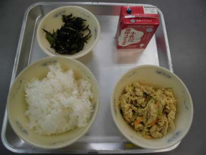 「ごはん」「牛乳」「あげたま煮」「小松菜とひじきの炒めもの」です。