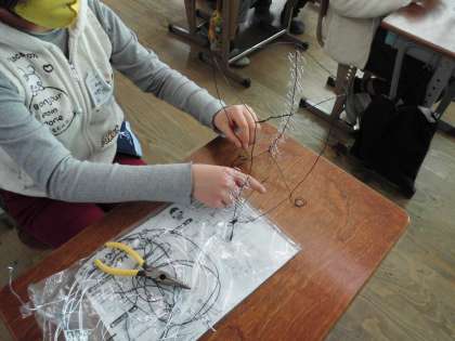 ワイヤーアートの技法「つなぐ」「巻きつける」「らせん」を試し,ペンチも使って取り組んでいました。立体の作品を作ることに難しさも感じていましたが,作品ができた時「立った!」「おもしろい!」とそれぞれが楽しんで作品作りをしていました。