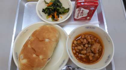 3月3日(水),今日の給食は「さつまいもパン」「牛乳」「大豆と鶏肉のトマト煮」「小松菜のソテー」でした。