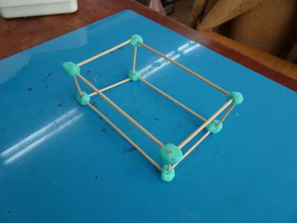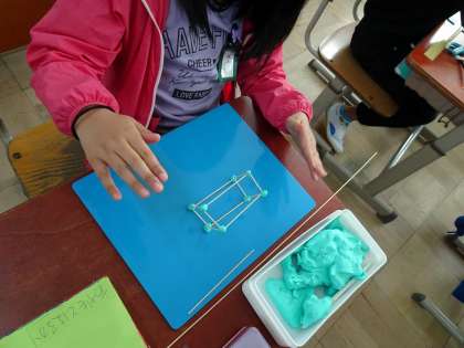 算数科「はこの形」の学習で,辺と頂点の数を確かめるために,ひごと粘土を使って,はこ作りを行いました。