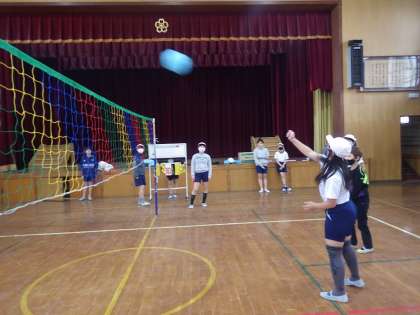 「ナイスサーブ!」「ドンマイ!」とチームで声を掛け合って,みんなで試合を楽しんでいます。