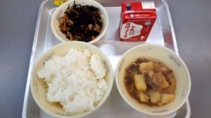 3月5日(金)今日の給食は,「ご飯」「牛乳」「肉じゃが」「ひじきの煮つけ」でした。給食の肉じゃがにはいろいろな種類があります。おなじみのものから,「ピリ辛みそ味」「カレー味」などです。今日の肉じゃがには京都産の和牛を使っています。いつもの肉じゃがとは,違ったでしょうか?味わった感想をぜひご家庭でも聞いていただけると嬉しいです。