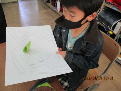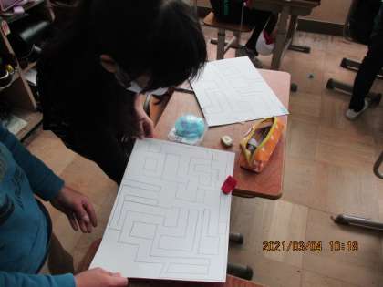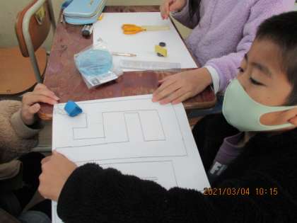 理科の時間に,じしゃく迷路を作りました。まず,画用紙に「迷路」をかき,次に磁石を付けた「こま」を作ります。最後に画用紙の下から別のじしゃくを近づけて「こま」を動かして,迷路のゴールを目指します。磁石の性質をを生かしたおもちゃに夢中になっていました。