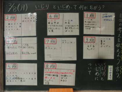 道徳科では,教材を通して「いじりといじめは何が違うのか。」ということについて考えました。いじりといじめの違いや共通点についてグループで話し合い,全体で交流しました。いじりはいじめの始まりであり,みんなが仲良く楽しく過ごせるように,相手の気持ちを考えて行動していきたいと振り返っていました。