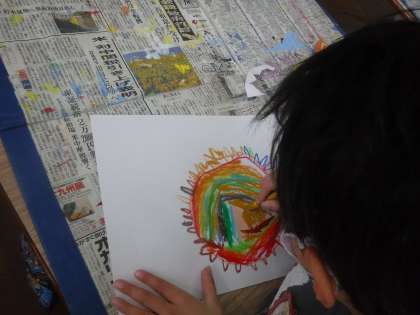 「こんなお花があったらいいな。」「花の中に虹をかいてみよう。」と工夫して,カラフルな花が咲きました。