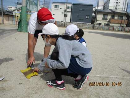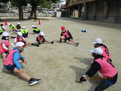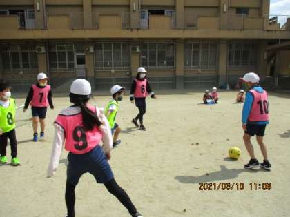 3年最後の体育は,サッカーです。みんなで協力して準備し,グループで体操をし,試合をします。久しぶりにゲーム形式で,ボール運動ができ,楽しそうです。