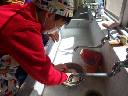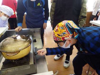 本来はごはんとみそ汁を作るのですが,感染対策のためにごはんのみの実習にしました。炊けた後も,教室に運んでそれぞれが前を向いて食べるというイレギュラーな実習でしたが,どの班のごはんもほどよい水加減でおいしく炊けていました!