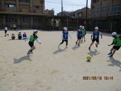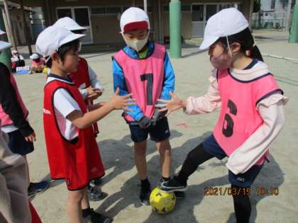 体育のサッカーも4時間目。ゲームの進め方にも慣れ,動きもよくなってきています。どちらのチームのボールか分からなくなった時は,じゃんけんで決めています。このクラスで体育をするのもあと2時間。いいゲームをしてほしいと思います。