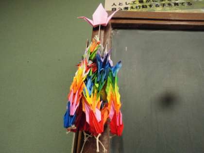 掃除を終えて昼学習をしていると「6年生を送る会で祝ってくれたお礼に。」と,6年生が折り紙で作った千羽鶴をサプライズプレゼントしてくれました。6年生がくれた千羽鶴に向かって両手を合わせ,心の中で願い事をしている子ども達の姿がとても微笑ましかったです。