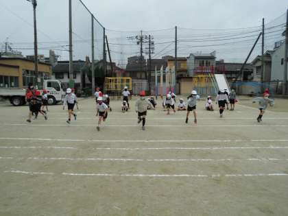 まず1つ目はとびくらべです。5歩でどこまで遠くに行けるか頑張っています。足を大きく開いて,腕を振って,思い切り前に進んでいきます。どの線まで行くことが出来るか確かめています。