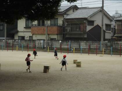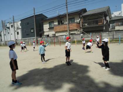 三つ目は大縄跳びです。これはグループで「大波小波」や「郵便屋さん」を順番に挑戦しています。跳ぶのはもちろんですが,縄を回すのも上手になってきました。