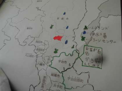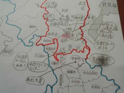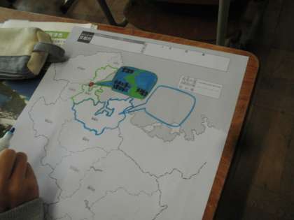 社会科では,1年間の学習の振り返りとして,京都府の特徴を白地図にまとめています。子ども達は,地域の特徴や京都府の良さを伝えるためのマップを作っていました。