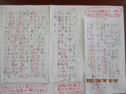 3年生最後の国語は「モチモチの木」の学習でした。何度も音読し,読みを深めてきました。最後の話し合いは「豆太は変わったか?」です。「変わった」か「変わってない」か自分の考えを見つめます。話し合いを進めていくうちに,自分とは反対の考えにも触れ,自分の考えを深めていきました。「ふりかえり」のノートには,しっかり考えられた充実感が伝わる文章がたくさんありました。