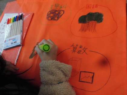 今日は,作品バックに1年間の思い出を描きました。「友だちと遊んだこと」「4年生で学習したこと」など,子ども達は1年間の出来事を振り返りながら,描いていました。