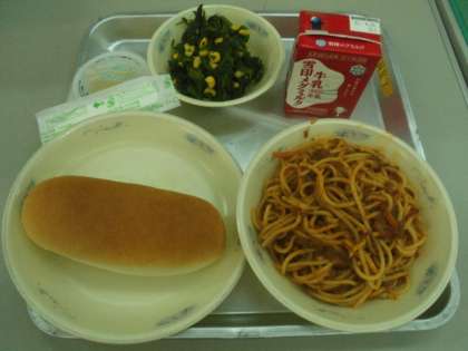 今日の給食は「牛乳」「小型コッペパン」「スパゲティのミートソース煮」「ほうれんそうのソテー」「りんごゼリー」でした。