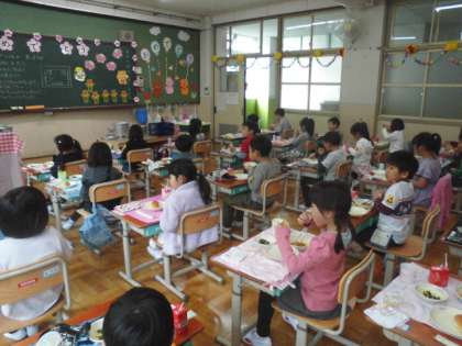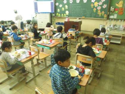 今年度初めての給食で,中間休みのころから「いいにおいがする。」というつぶやきも聞こえてきました。とても楽しみにしていたようです。おいしそうにいただいていました。これからもたくさん食べて,元気に過ごしてほしいです。