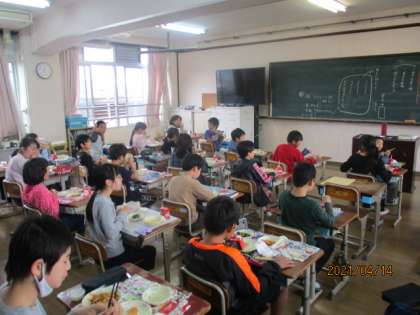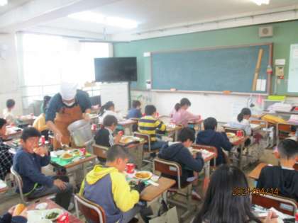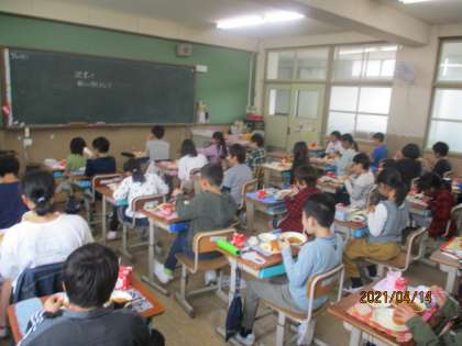 今日から学校給食が始まりました。今日は,スパゲティやリンゴゼリーなどがメニューにあり,子ども達も「スペシャルメニューだー!」と喜んでいました。