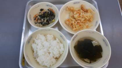 今日の給食は「和(なごみ)献立」で,「ごはん」「湯葉のすまし汁」「春野菜のかきあげ」「小松菜と切干大根の煮びたし」でした。
