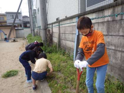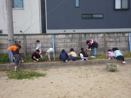放課後に6年生の有志4人と学校園の草抜きをしていると,他の学年の人たちも次々と手伝ってくれました。最終的にはこんな人数に…!