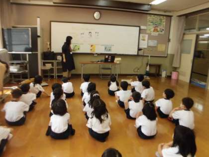 初めて入るふれあいサロン。ちょっとドキドキしながらも,保健室の先生の話をピシッとした姿勢でしっかり聞くことができました。