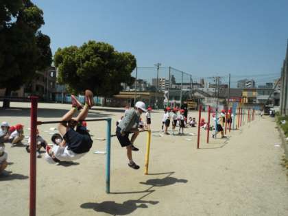 次に,運動場にでて,鉄棒で自分の今できる遊びや動きの繰り返しにチャレンジしました。(ねらい1)