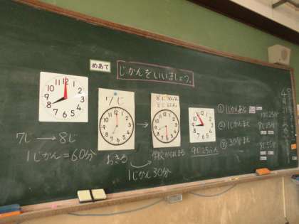 はじめに,時計の1目盛りは1分であること,1時間は60分であることを確認した後,時間の問題にチャレンジしました。